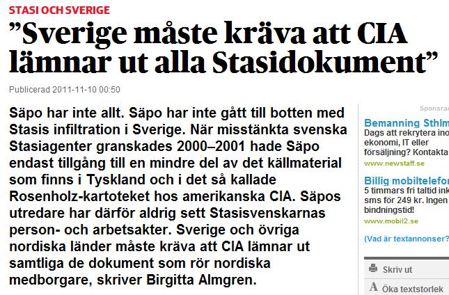 Många hoppades att Wikileak-dokumenten skulle kasta lite ljus över stasiarkiven men så blev inte fallet. Den som däremot skulle börja kasta lite mer ljus över stasiarkiven var den pensionerade professorn, Birgitta Almgren, som med sina böcker ”Inte bara Stasi” men framförallt boken ”Inte bara spioner” fick upp medias intresse för frågan.