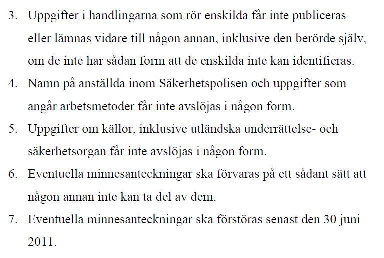 ”Dessutom måste hon förstöra alla anteckningar, som hon fört under sin research hos Säpo. Det gäller såväl handskrivna noteringar som datafiler. Senast den 31 december 2014 klockan 23.59:59 ska allt vara förintat.”