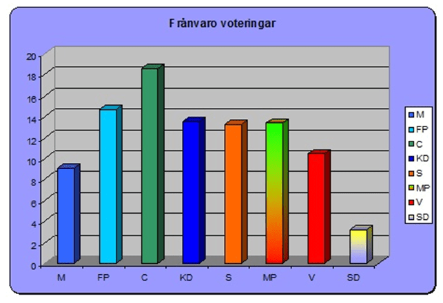 Det var en av de få positiva effekterna av att vi inte fick vara med i kvittningssystemet. Det fanns ledamöter från andra partier som hade 50 procents frånvaro från voteringarna i riksdagen. Här framgår det med all tydlighet hur ledamöterna i 7-klövern utnyttjade kvittningssystemet. Centerpartiet hade drygt 18 procents frånvaro vid voteringarna. SD hade mindre än 3 procents frånvaro och var bäst i klassen.