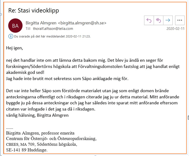 Jag undrar om det var en följd av de begränsningar som Kammarrätten beslutade om i samband med att Birgitta Almgren fick ta del av dokument i stasiarkivet.