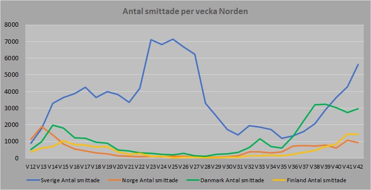 Jag har börjat sammanställa uppgifterna per vecka och när man ser utvecklingen i antal smittade i de nordiska länderna så förstår man varför dessa journalister tystnat.