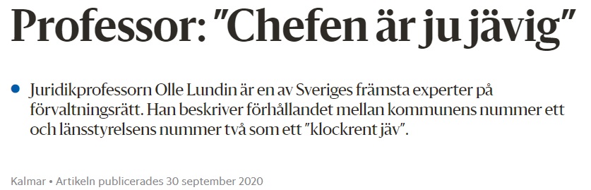 – Men den stackars landshövdingen… Han kan inte ens be någon anställd bereda ärendena heller, eftersom de har en jävig chef. Så landshövdingen sitter där helt solokvist när det gäller ärenden som rör Kalmar.”