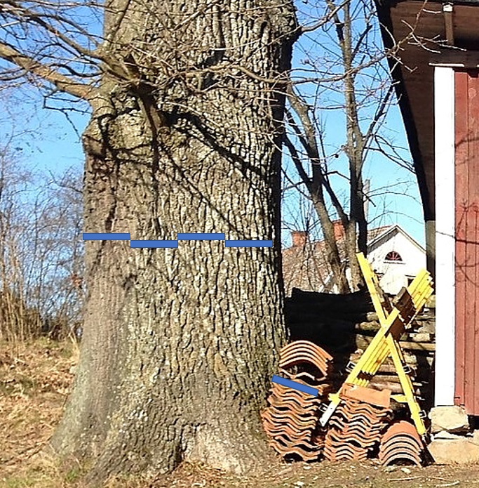 De enda som nu kan göra en mätning av stubben är Länsstyrelsens tjänstemän om de fick in en ny anmälan som grundade sig på fotot jag fått och mina uppskattningar av ekens verkliga diameter i brösthöjd.
