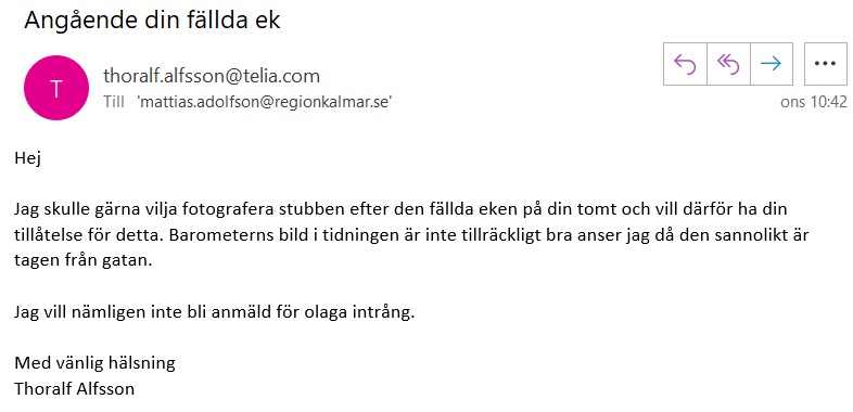 För att verkligen kontrollera stubbens diameter måste det ju dokumenteras väldigt väl. Därför skrev jag ett mejl till Mattias Adolfson och frågade om jag fick gå in på hans tomt och fotografera stubben. Jag hade även tänkt att mäta stubben på flera olika håll, både diameter och omkrets. Här är mitt mejl till Mattias Adolfson. Jag ville nämligen inte bli anmäld för olaga intrång.