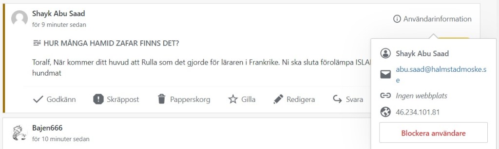 Nu har jag fått nya dödshot från Halmstad moské! Om man skall tro avsändaren. Uppenbarligen någon idiot som inspirerats av halshuggningen i Frankrike.