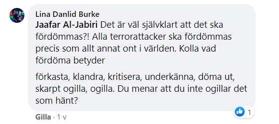 En person skriver då en kommentar att alla politiker ska fördöma dessa bestialiska och islamistiska terrordåd.