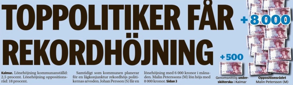 Den 25 november 2011 avslöjade jag i ett blogginlägg hur det socialdemokratiska kommunalrådet Johan Persson höjde sin egen månadslön med 6 000 kronor till 57 000 kronor men även för det ledande moderata/alliansens oppositionsrådet Malin Peterssons (Almqvist) lön med hela 8 000 kronor per månad från ca 46 000 kronor till ca 54 000 kronor. Det var häpnadsväckande lönehöjningar med tanke på att efterverkningarna av finanskrisen 2008-2009 levde kvar med stora sparbeting i den kommunal verksamheten.