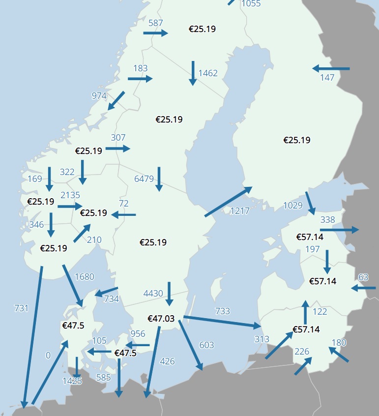 Man kan tolka bilden på olika sätt och det gör jag nu. Södra Sverige tillhör elområde SE4 och idag exporterar SE4 till flera länder. 733MW till Litauen, 603MW till Polen, 426MW till Tyskland och slutligen 956MW till Danmark.