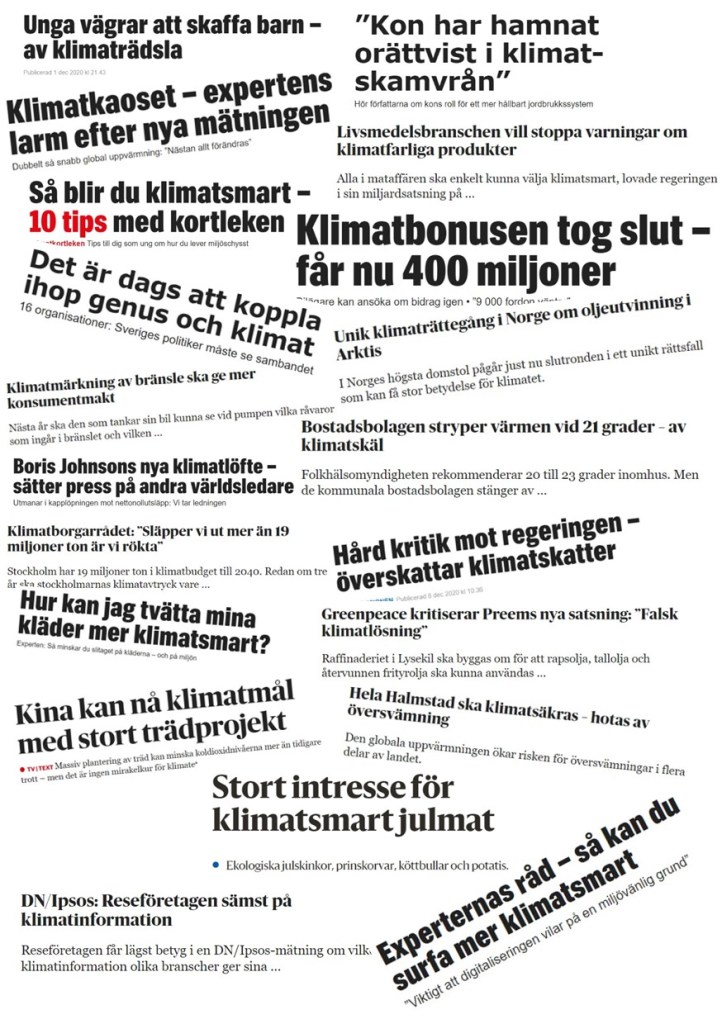 Efter gårdagens blogginlägg med rubriken ”Klimattokig” fortsatte jag fundera över missbruket av ordet klimat. Jag började titta efter lite exempel i media. Det finns ju minst sagt många skrämmande exempel på detta. Rubriksättarna tycks tävla om de mest uppseendeväckande rubrikerna men bryr sig uppenbarligen inte om relationen till verkligheten och sanningen. Jag satte samman denna bild med exempel.