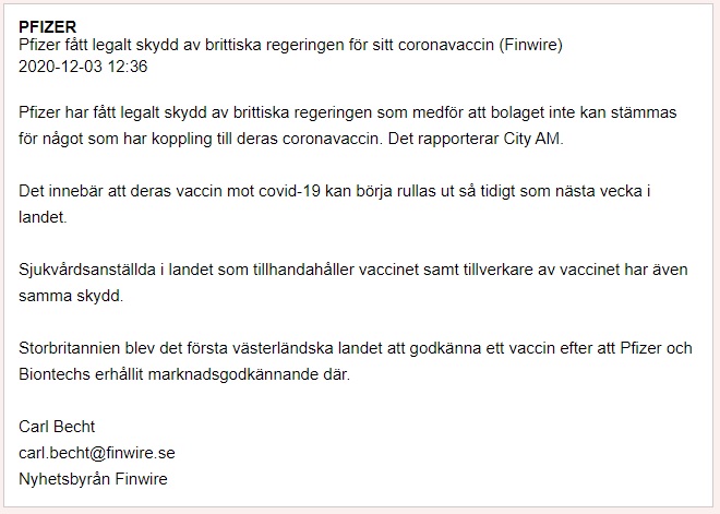 ”Pfizer har fått legalt skydd av brittiska regeringen som medför att bolaget inte kan stämmas för något som har koppling till deras coronavaccin.”