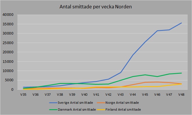 I våra nordiska grannländer är dock ökningen marginell. I Norge minskar antalet smittade till och med. Skillnaden mellan Sverige å ena sidan och övriga nordiska länder är slående. Varför är det så här. Det är regeringen som har det fulla ansvaret.