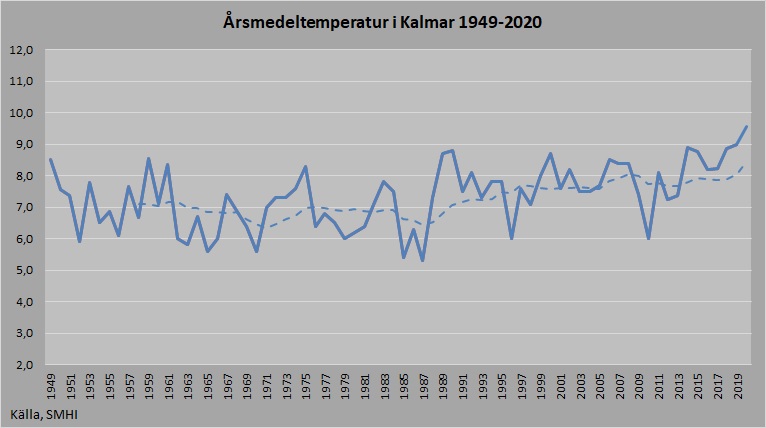 2020 blev återigen ett nytt rekordår för medeltemperaturen i Kalmar. Det blev det tredje året i rad som rekordet slogs. För 2018 uppmätes medeltemperaturen till 8,9 grader enligt SMHI och för 2019 blev den 9,0 grader.