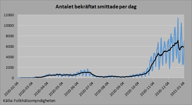 Jag har sedan kommit fram till att SVT Rapport i själva verket visar det glidande medelvärdet över 7 dagar i sin kurva enligt den svarta kurvan nedan. Alla kan säkert se att den svarta kurvan nedan överensstämmer med kurvan som SVT Rapport visade den 5 januari.