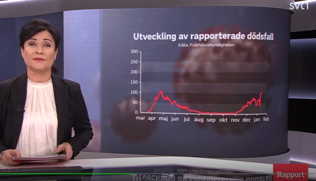 Idag läste SVT Rapport upp en rättelse om att kurvan över antalet avlidna i covid-19 inte var korrekt den 5 januari. Både i sändningen 18:00 och 19:30. Jag gjorde två anmälningar om detta till Granskningsnämnden i förra veckan angående hur SVT Rapport rapporterar statistiken, inte bara kurvorna utan även vad man säger att kurvorna visar, vilket är felaktigt.