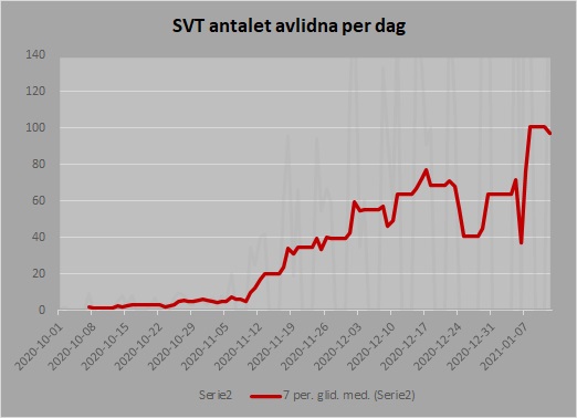 Men som jag skrev så är det ett 7-dagars glidande medelvärde som SVT visar i sin kurva och därmed visas inte det verkliga antalet avlidna per dag. Men eftersom det råder en så stor eftersläpning på registreringen av antalet avlidna så har jag en viss förståelse för hur SVT rapporterar. Men jag skulle vilja se även det verkliga antalet avlidna som en kurva i samma diagram men den kurvan kan inte vara för de senaste dagarna eller veckorna på grund av eftersläpningen.