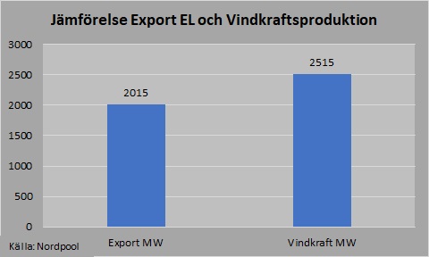 Som jag skrev tidigare så hade vindkraften producerat ca 2 515MW som medel per dygn under denna tidsperiod. Under samma tidsperiod hade vi som medelvärde per dygn exporterat en effekt på 2 015MW.