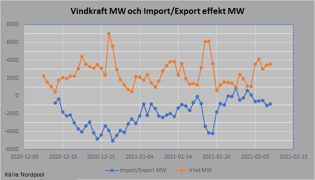 Det vi kan se är att när det blåser lite mer och vindkraften producerar ganska bra så exporterar vi nästan all den energi som vindkraften producerar (minus innebär export för den blå kurvan).