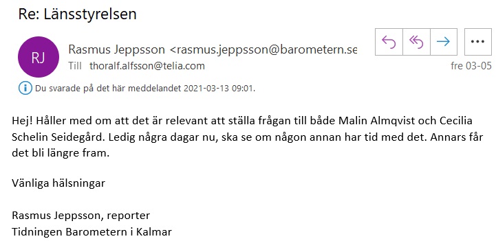 Jag tyckte att det var märkligt att den nya landshövdingen Peter Sandwall fick stå till svars i artiklarna för den urusla ekonomin då han tillträde sin tjänst den 21 september 2020 och att han knappast kan läggas till last för de stora ekonomiska bristerna i Länsstyrelsens ekonomi. Efter att Barometern även publicerat en andra artikel för några veckor sedan så skickade jag ett mejl den 4 mars till journalisten Rasmus Jeppsson och undrade varför tidningen inte ställt frågor till före detta länsrådet Malin Almqvist som slutade den 30 november vid Länsstyrelsen. Det var ju hon som hade det ansvaret för det dagliga arbetet.