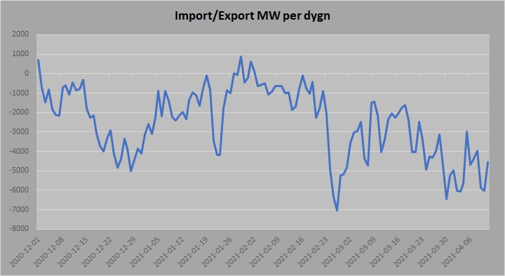 En intressant iakttagelse är att sedan den 1 december är det bara 4 dygn som Sverige importerat mer elenergi än vad vi exporterat elenergi. Alltså bara 4 dygn av cirka 130 dygn. Något som förvånade mig en hel del då det varit en ganska kall vinter under vissa perioder. Vissa dygn kanske Sverige importerat elenergi under några timmar men när vi summerar dygnet så har vi ändå exporterat elenergi. Vi kan importera under dagtid och exportera nattetid. Här nedan är en graf över import/export av elenergi.