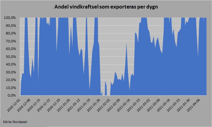 Under 41 dygn av dessa ca 130 dygn sedan den 1 december exporterades varenda producerad kWh från vindkraften. Under dessa 41 dygn hade alltså Sverige inget behov av vindkraften utan all vindkraftsel exporterades till våra grannländer. Det innebär att under 32 procent av denna tid behövde Sverige inte vindkraften då hela produktionen exporterades.
