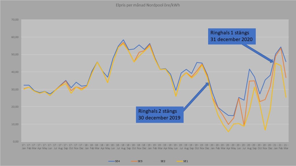 Frågan jag ställer mig är om det finns ett samband med nedstängning av Ringhals 2 den 30 december 2019, då försvann en elproduktion på ca 860 MW från södra Sverige. Den 31 december 2020 stängdes även Ringhals 1 ned och ytterligare 860 MW i elproduktion försvann från södra Sverige. Jag har markerat det i diagrammet.