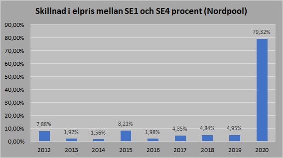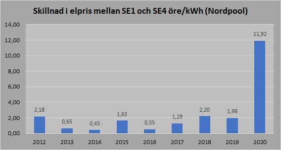 Under 2020 var det genomsnittliga elpriset på Nordpool närmare 80 procent högre inom elområde SE4 än för elområde SE1.