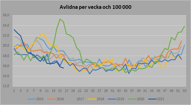 Så här visade Socialstyrelsen data över avlidna per vecka för åren 2015-2021 vecka 16.
