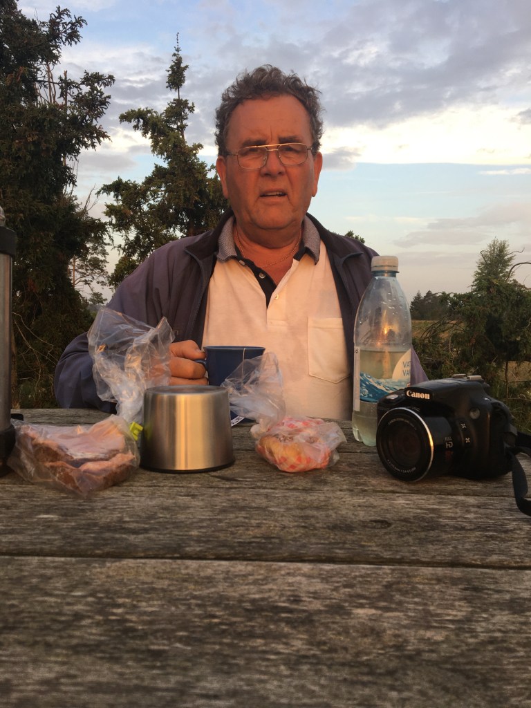 Det finns faktiskt ett bord med sittplatser vid den södra flisan. Det blev en njutbar morgonfika vid ca 05:00 i den tidiga morgonsolen.