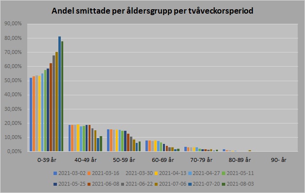 Antalet coronasmittade har sakta stigit under de senaste 5 veckorna, från ca 1500 smittade under vecka 27 till drygt 5400 smittade vecka 32. Antalet smittade ökar i alla åldersgrupper men ca 80 procent av de smittade tillhör gruppen 0-39 år, där vaccinationsgraden är som lägst.