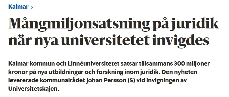 Är det Kalmar kommuns ansvar att satsa 100 miljoner kronor av kommunens skattemedel på en juridikutbildning vid Linneuniversitetet? Är det ännu ett utslag av socialdemokraternas och Johan Perssons maktfullkomlighet i Kalmar?