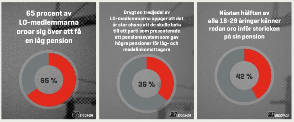 Byggnads redovisar även svar på en enkät med tre frågor. I den framgår det att en dryg tredjedel kan tänka sig att byta parti i valet om ett parti presenterar ett pensionssystem som ger högre pensioner för låg och medelinkomsttagare.