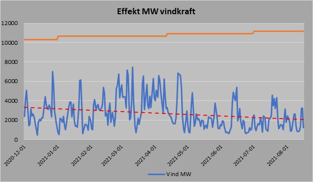 Skillnaden mellan den totala installerade effekten vindkraften och vad den i genomsnitt producerar har knappast aldrig varit större än den varit under sommaren 2021. Medeleffekten har varit 1 946MW under perioden 1 maj till 15 augusti. Det motsvarar en verkningsgrad på ca 17,5 procent för vindkraften. Något som bevisar svagheten med väderberoende elenergiproduktion.