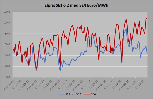 Nedan en jämförelse av elpriset mellan norra Sverige som finns i elområde SE1 och SE2 med södra Sverige som finns i SE4. Grafiken är från 1 maj till 31augusti under 2021.