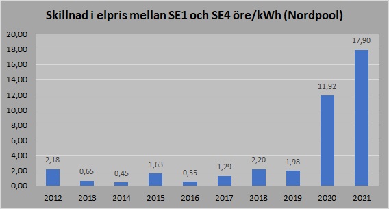 Elområde SE1 och SE2 har alltid samma pris av någon anledning. Under vissa tider är elpriset 2-3 gånger så högt i södra Sverige som det är i norra Sverige. Det innebär många tusenlappar extra för en elkonsument i södra Sverige under ett år.