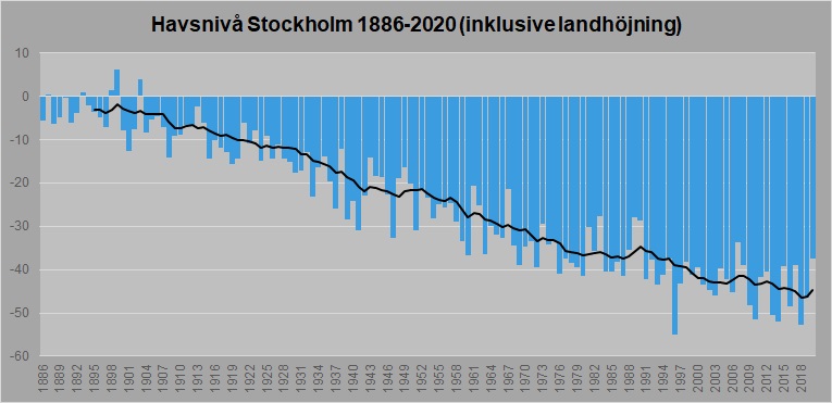 Hela diagrammet är dock fejk och lurendrejeri från SMHI, då man dragit bort landhöjningen. Så här skriver man under diagrammet.