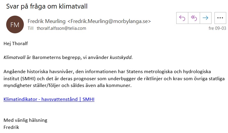 Precis som jag förväntade mig så hade Mörbylånga kommun inga fakta, utan man hänvisade till prognoserna från SMHI. Fredrik Meurling skickade till och med en länk till en webbsida.