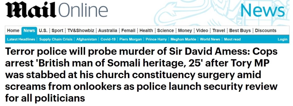 Den som polisen gripit är alltså en 25-åring med somalisk bakgrund, med andra ord en somalier. Jag tror inte somalier är mer lättintegrerade i Storbritannien än de är i Sverige. Med andra ord är det sannolikt ännu en islamist som mördat den engelska parlamentsledamoten.