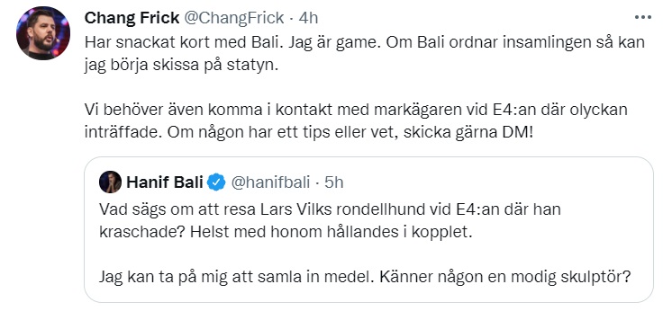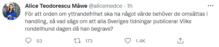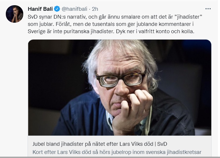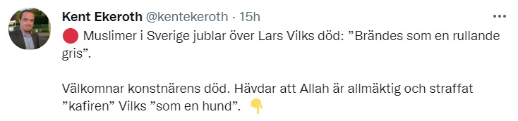 ”Äcklas över alla i de politiska-/kulturella-/mediala etablissemangen som nu kliver fram och beklagar sig över Lars Vilks död. Samma etablissemang som under alla år hukat/tigit/tagit avstånd från honom och därmed yttrandefriheten på riktigt. De har genom sitt totala svek aktivt stöttat och bidragit till att denna i religion förklädda ideologi med sjumilakliv flyttat fram sina positioner och kväver allt vad mänsklig frihet, demokrati och yttrandefrihet heter. Skämmes ta mig faen. Men inte heller det har naturligtvis dessa ynkryggar och Quislingar vett eller ryggrad till.”