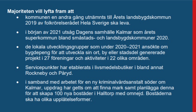 Det är intressant att Kalmar kommun skriver på hemsidan att över 90% av invånarna rekommenderar Kalmar till andra personer. Hur vet man detta? Det är mycket fokus på att vinna utnämningar, omröstningar, få folk att flytta till kommunen m.m. Man är helt besatt av detta.