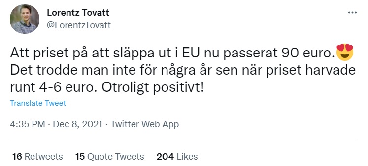 Det är då minst sagt provocerande att se miljöpartiets riksdagsledamot Lorentz Tovatt som dessutom är energipolitiska talesperson för Miljöpartiet i riksdagen twett om hur glad och lycklig han är över att priserna på utsläppsrätterna nu gått från 4-6 euro till att ha passerat 90 euro.