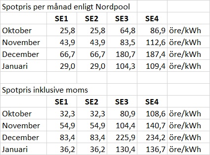 Spotpriset inklusive moms inom SE1 och SE2, det vill säga norr om Dalälven hamnar på ca 36 öre per kWh. Ett väldigt lågt pris och jag skulle vara överlycklig med det priset på min elräkning. Eftersom jag bor inom SE4 kan jag istället förvänta mig ett pris på minst 137 öre per kWh. Till dessa pris kommer även elbolagens påslag på elpriset sannolikt bara några ören inom SE1 och SE2 men inom SE4 kan vi säkert förvänta oss ca 10 öre i påslag, då det var ca 13 öre i december.