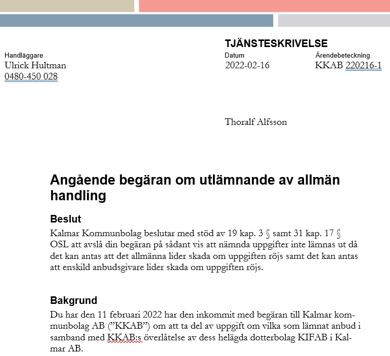 Jag kontaktade Ulrick Hultman som är vd vid Kalmar kommunbolag och frågade vilka företag/bolag som lämnat anbud. Jag fick nej på min förfrågan och senare även ett skriftligt sekretessbeslut!