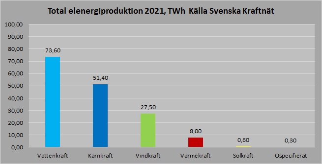 Elenergiproduktion för respektive energislag under 2021. Närmare 100 procent fossilfri!