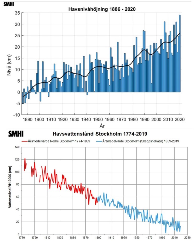 SMHI är annars väldigt duktiga själva på att luras. När SMHI i sin klimatindikator vill visa havsnivåhöjningen i Östersjön så visar de den övre grafiken nedan på sin webbsida. De som däremot letar upp en av världens längsta mätserie av havsnivå kan hitta den nedre grafiken över Stockholm sedan 1774. Detta också på SMHI webbsida.