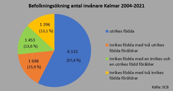 Sedan 2004 har befolkningen i Kalmar kommun ökat med 10 679 personer. Av dessa är 6132 utrikes födda 0ch 1 698 inrikes födda av två utrikes födda föräldrar. Det innebär att drygt 73 procent av befolkningsökningen har utrikes bakgrund och en majoritet kommer från MENA-länder.