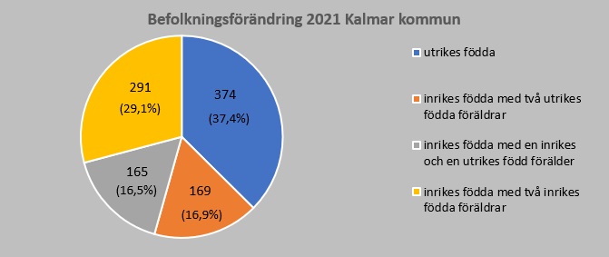 Jag har bara tittat på Kalmar som under 2021 ökade sin befolkning med 999 personer. Utav dessa hade 543 personer utländsk bakgrund, det vill säga 374 var utrikes födda och 169 personer var inrikes födda men av två utrikes födda föräldrar.