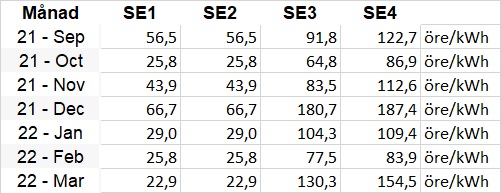 Prisskillnaden mellan elområde SE1/SE2 och elområde SE4 har aldrig varit så stort som det blev i mars. Månadens spotpris blev i SE4 (södra Sverige) hela 154,5 öre/kWh. I norra Sverige blev spotpriset endast 22,9 öre/kWh.