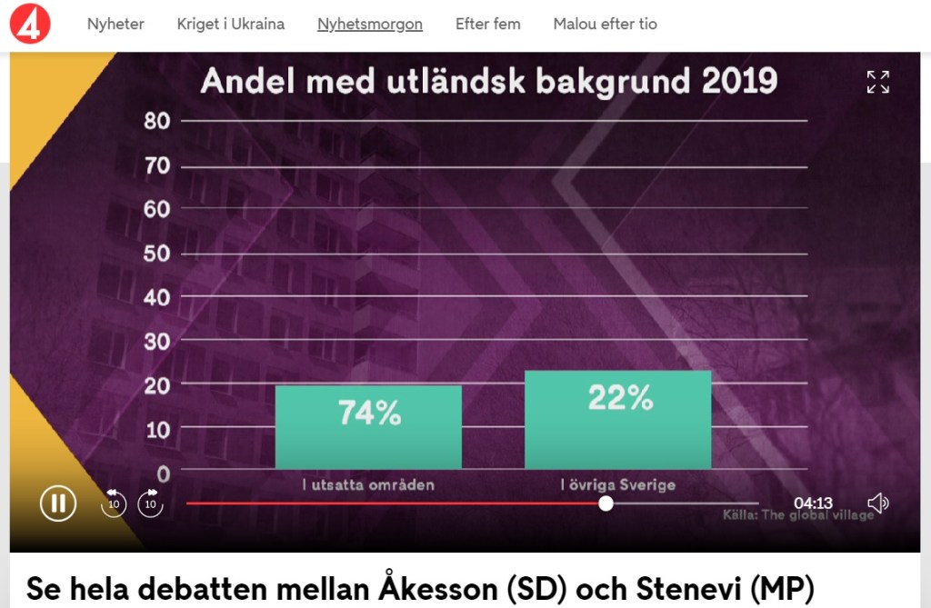 Men det värsta stod nog ändå TV4 för under debatten när de visade grafen över andelen med utländsk bakgrund i utsatta områden och jämförde det med övriga Sverige.