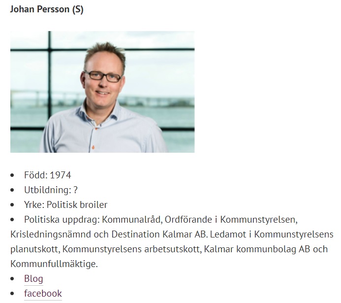 Kalmars kommunalråd Johan Persson har aldrig haft ett riktigt jobb. Antingen har han varit avlönad av Socialdemokraterna eller så är det skattebetalarna som får betala hans lön som politiker. Det är beklämmande men samtidigt också utmärkande för en person som man kallar för en ”politisk broiler”.