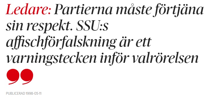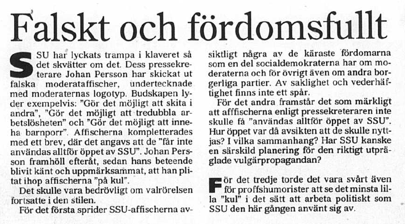 I sin research hade Undertecknat dock missat en hel del av vad Johan Persson sysslat med under sin tid i SSU. Det som fick störst uppmärksamhet och störst rubriker var dock när Johan Persson som pressekreterare för SSU gjorde falska valaffischer innan valet 1998 med Moderaternas logga och skickade ut till SSU-avdelningar.